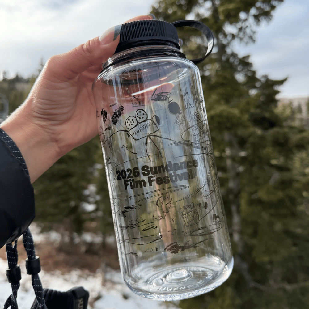 Stay hydrated with this wide-mouth Nalgene water bottle featuring the “2026 Sundance Film Festival” logo alongside hand-drawn illustrations of a director’s chair, motion picture camera, film strip, and clapperboard. |